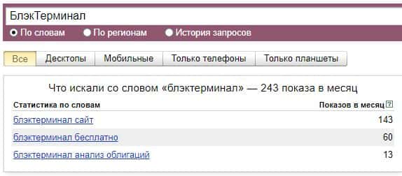 Если проверить насколько часто вводят бренд конторы "БлэкТерминал", то здесь мы можем увидеть показатель в размере 243 показов в месяц.