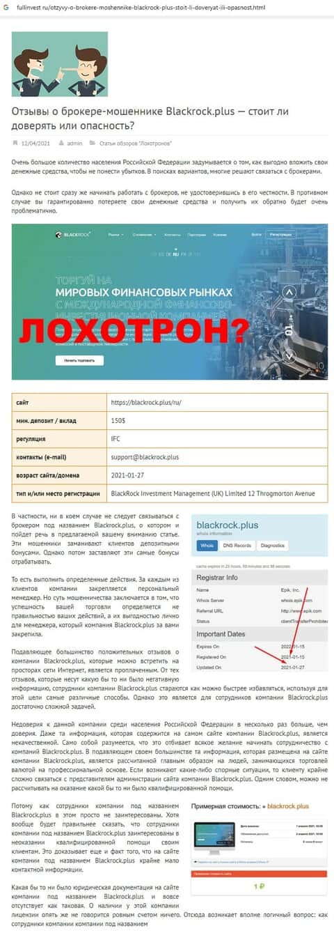 Юридическое лицо BlackRock Investment Management (UK) Limited владеет веб-сервисом Блэк Рок Плюс, главная цель которого, отъем денег у доверчивой части онлайн-сообщества.