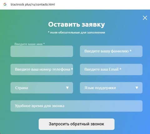 Аферисты Блэк Рок Плюс предлагают пользователям заполнить бланк сбора данных, где просят указать свое имя, фамилию, адрес электронной почты и номер телефона.