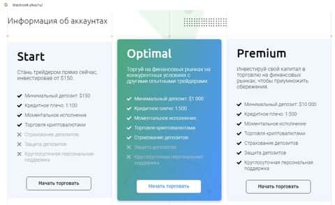 Жулики Блэк Рок Плюс предлагают клиентам на выбор 4 типа торгового счета: Start, Optimal, а так же Premium. Реальный Форекс стартует в основном с суммы в 100 000 долларов США.