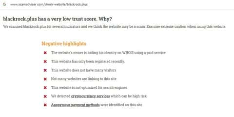 Уровень доверия к сайту жульнической конторы BlackRock Plus низкий