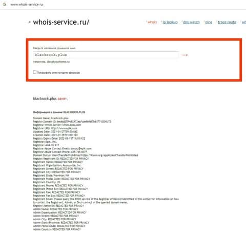 Проведя анализ данных по сайту Блэк Рок Плюс, не было найдено информации о владельце домена, что является еще одним признаком того, что имеем дело с лохотроном.