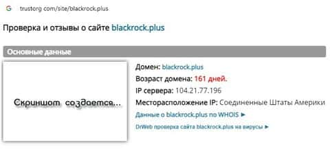 Проверка интернет-сервиса аферистов Black Rock Plus на trustorg com показала, что возраст домена к моменту написания статьи составляет 161 день, вероятнее всего домен купленный.