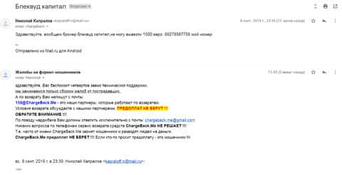 Далее представлена жалоба от реального клиента, который попался на удочку в аферу Блэквуд Капитал. Мошенникам удалось стащить у клиента около 20 000 рублей и менеджер, под псевдонимом Марк Демьянов, начал разводить на вложение большей суммы. После отказа ни копейки с ранее вложенных средств не отдали.