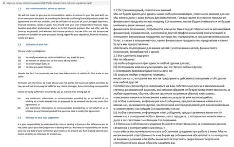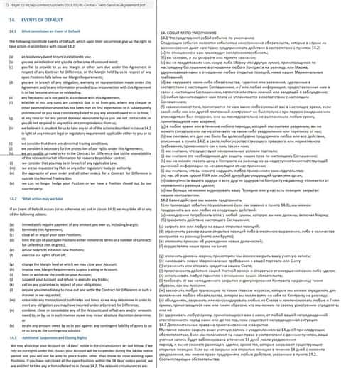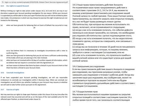 Листая дальше мошенническое соглашение от BLGM, которое растянуто аж на 53 страницы и написано на английском, находим еще интересные пункты. Например, в любой момент договор может быть расторгнут и аккаунт клиента закрыт, естественно, с переходом всех средств в карман аферистов.