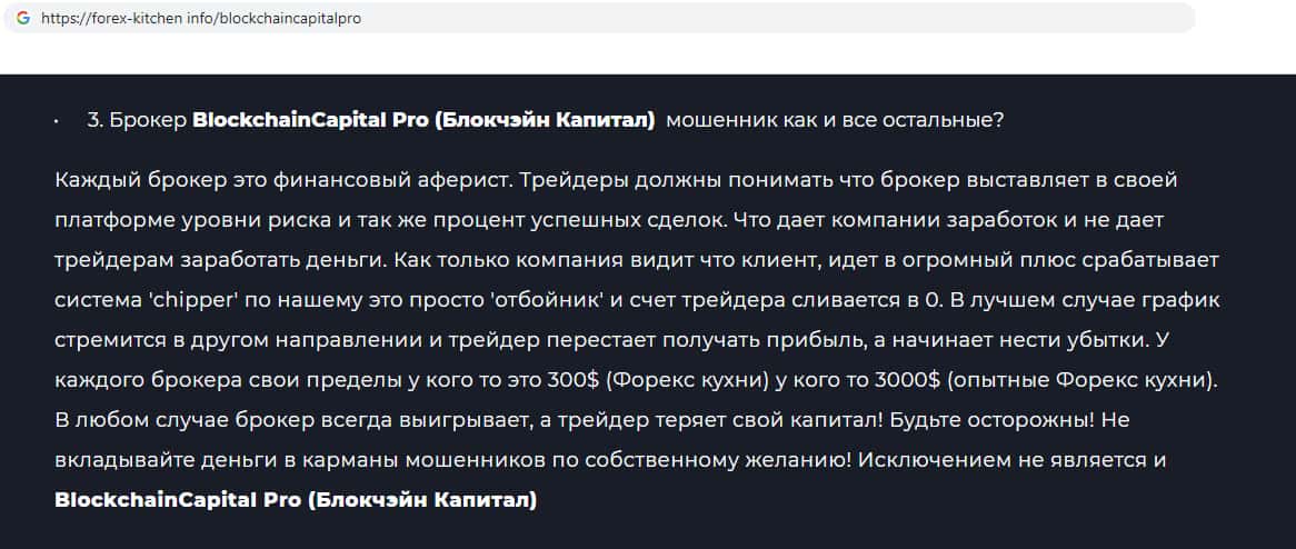 На сайте forex-kitchen info мы наткнулись на статью о кидалах BlockchainCapital Pro. В неё сайт рассказывает что данная компания является мошеннической. и её главная задача - это вытянуть как можно больше денег из пользователей. Компания никогда не даст заработать клиенту, так как устроенна таким образом, что заработать сможет только фирма, но никак не клиент.