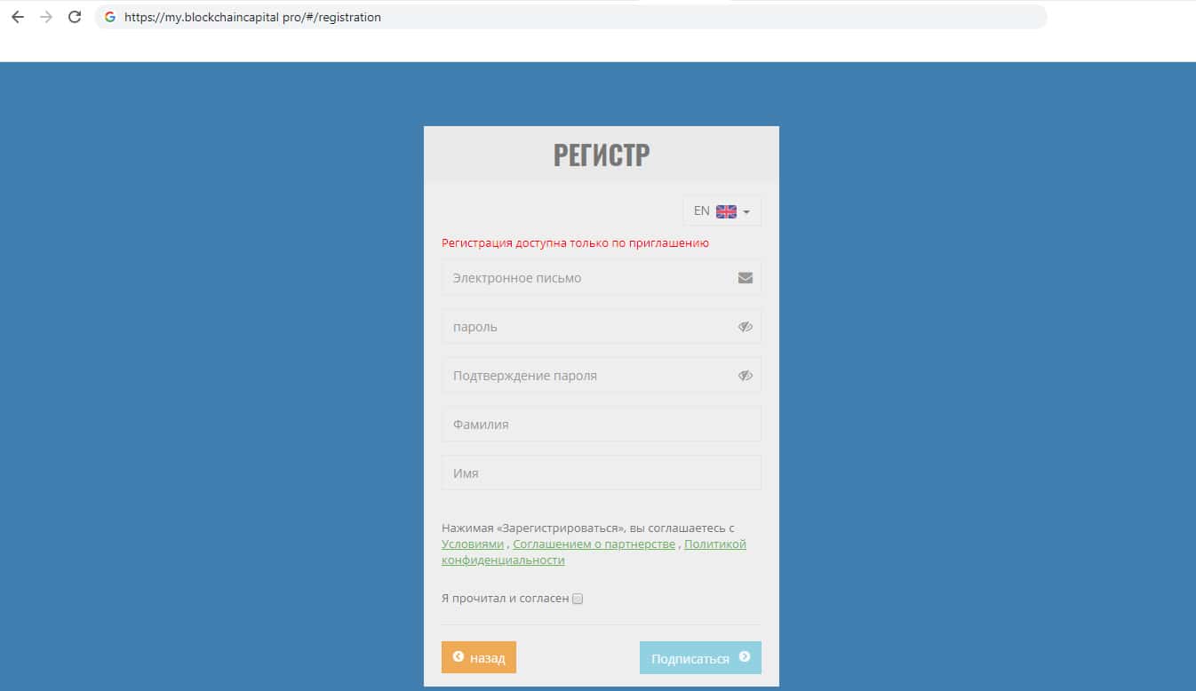 Оказалось, что обычный пользователь не сможет зарегистрироваться в компании BlockchainCapital Pro, регистрация доступна только по приглашению, которое должна предоставить компания или уже существующие клиенты компании по реферальной ссылке. Таким образом фирма придала себе солидности, что бы пользователи думали что если по приглашению. то точно не кинут, но работает это совсем наоборот.