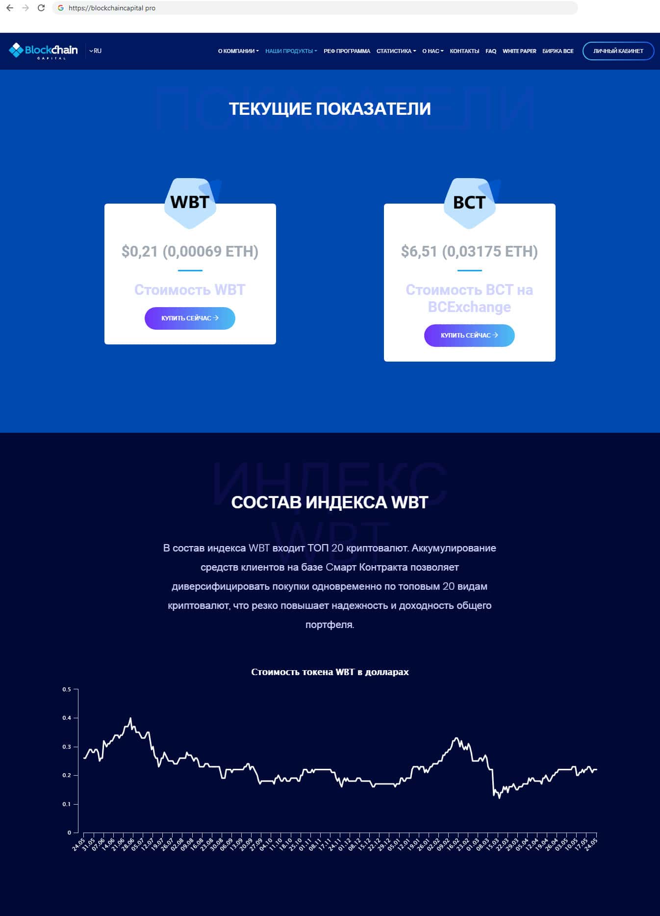 Фирма аферистов Блокчэйн Капитал продемонстрировала ценны на свой токен и индекс WBT, в который якобы входит топ 20 криптовалют. Фирма говорит о том, что этот индекс WBT повышает надёжность и доходность портфеля. Так же продемонстрирован рост их валюты, данный график просто нарисованный, что бы пользователи больше велись на эту информацию.