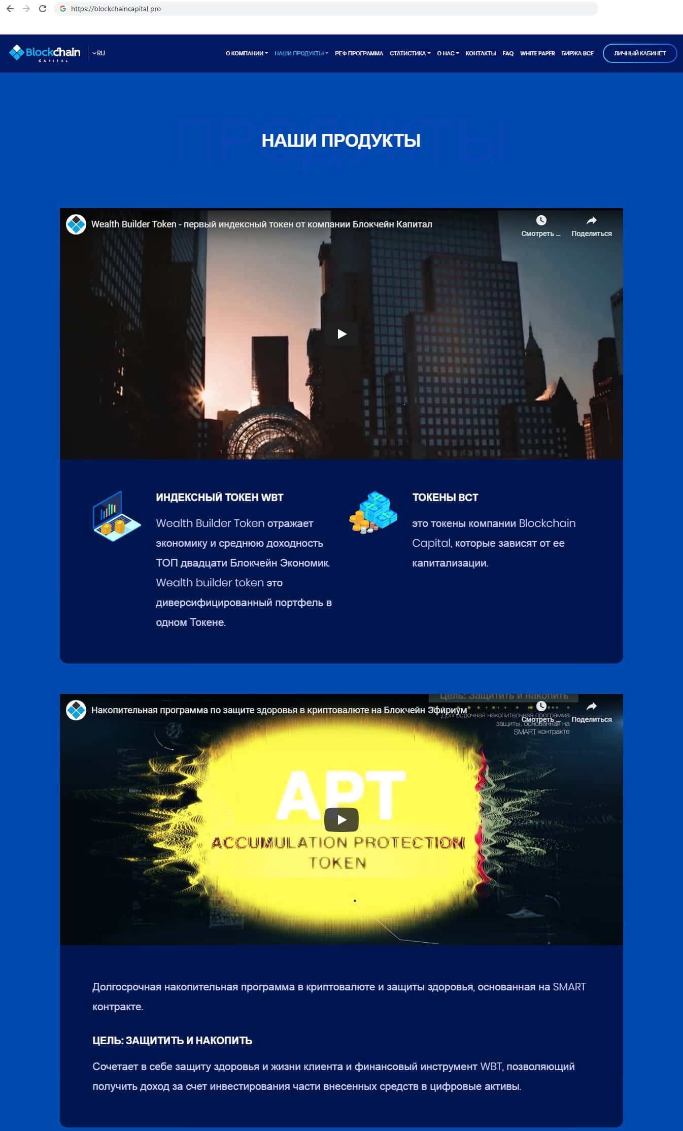 На главном сайте лохотронщики Блокчэйн Капитал продемонстрировали свои продукты, ими являются токены компании, которых нет ни на одной бирже, то есть они есть только внутри компании, и пользователи инвестируют свои деньги прямиком в карман жуликов, а компания демонстрирует поддельные цифры и кормит лживыми обещаниями.