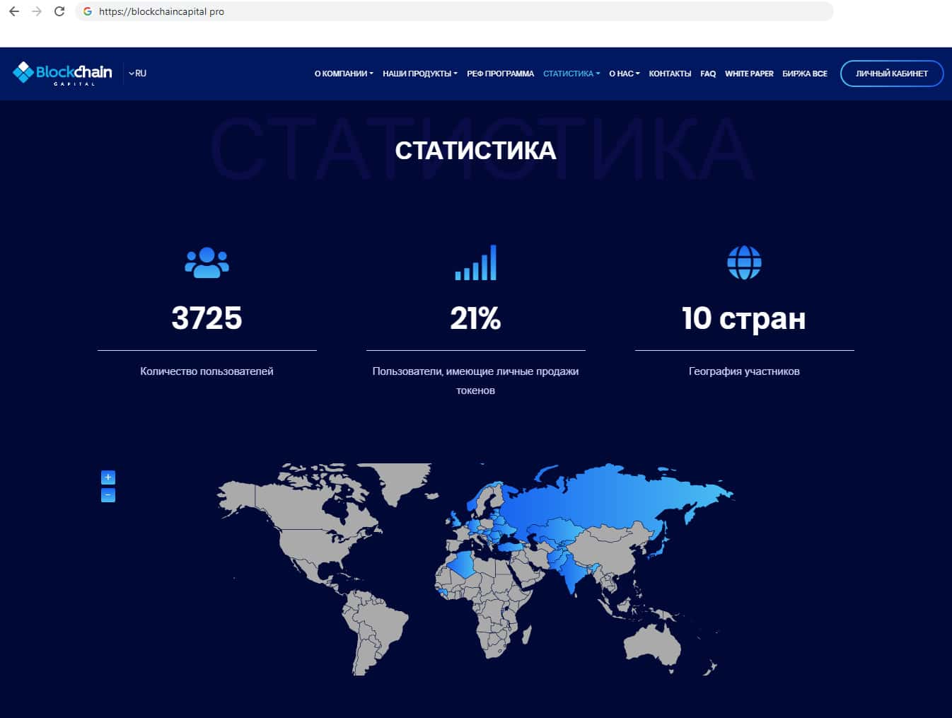 На сайте опубликована статистика компании BlockchainCapital Pro. Указанно, что фирма имеет более трёх тысяч клиентов, и сотрудничает с 10 странами, но как мы видим по карте, то это в основном страны СНГ, которые никак не защищены юридически, ведь компания подчиняется законам оффшорного государства.