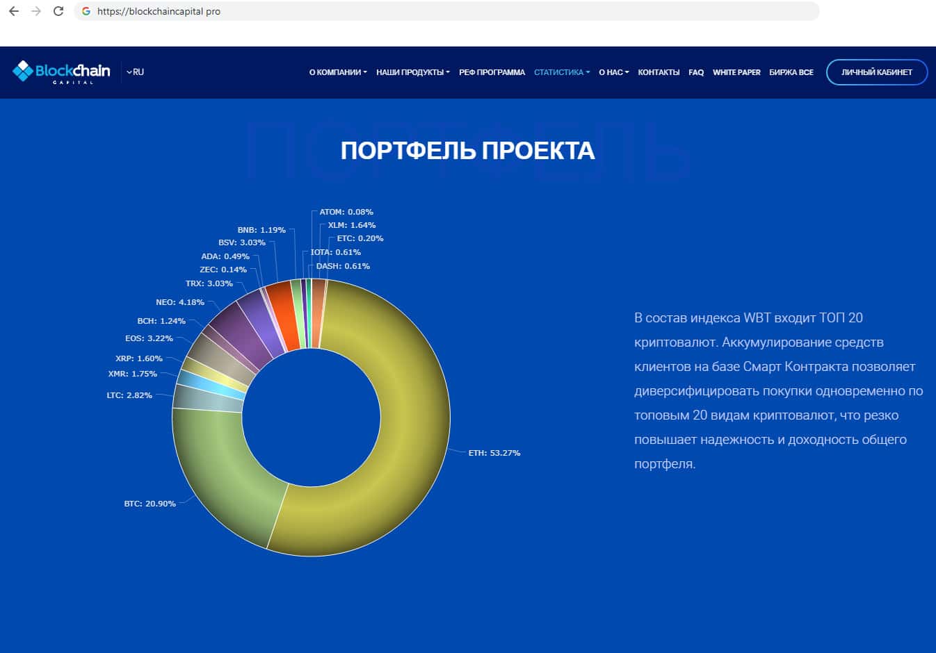 Так же аферисты BlockchainCapital Pro опубликовали информации о составе портфеля, который предоставляет их проект. Кидалы просто нарисовали статистику и сделали поддельный рисунок, что бы клиенты видя это тут же заинтересовались данным предложением. Компания идёт на любой обман, лишь бы привлечь внимание пользователей.
