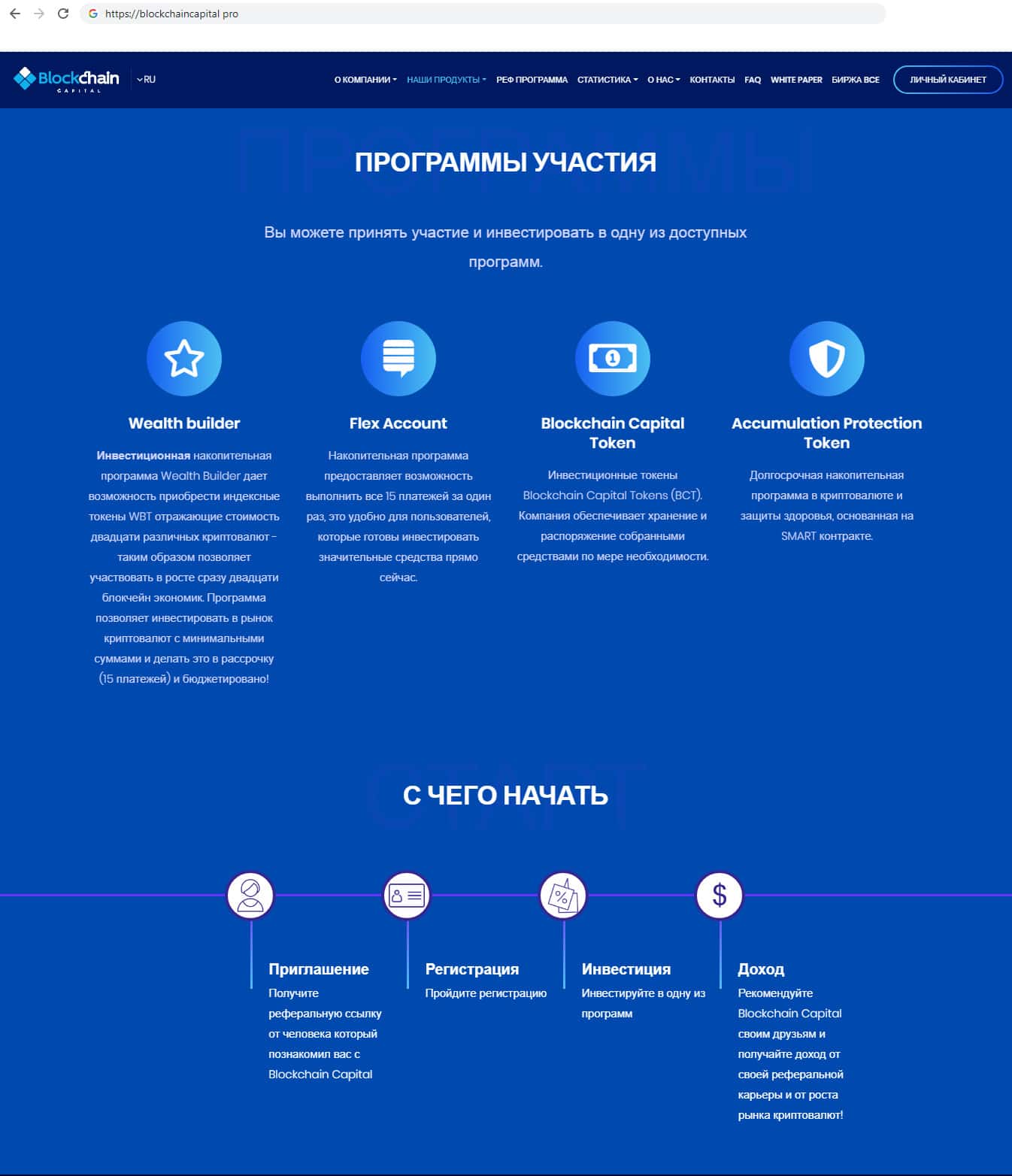 Шарашкина контора Блокчэйн Капитал предоставила на выбор несколько программ, куда пользователь может инвестировать. Так же разводилы Блокчэйн Капитал представили пункт в котором указали с чего нужно начать работать. Для этого нужно заполучить приглашение, зарегистрироваться и инвестировать, а потом якобы будет доход.