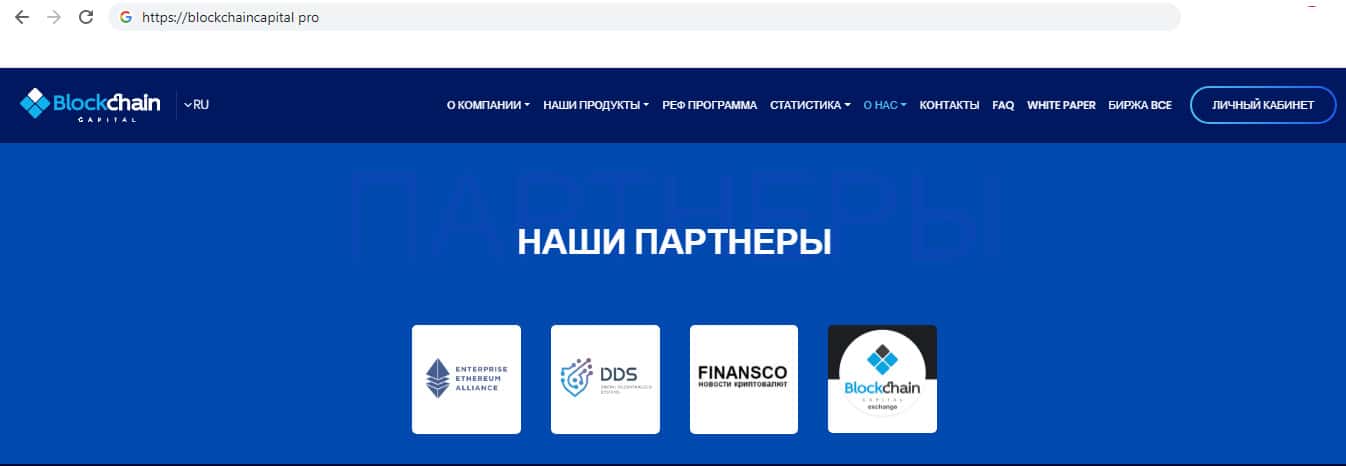 Представила компания махинаторов Блокчэйн Капитал и своих партнёров. Ссылки на эти компании расположены на сайте, но половина из них не работает. И возможно это мошеннические организации, которые сотрудничают с компанией, или это эти же мошенники, которые просто создали сайты в виде партнёров, что бы было легче одурачить пользователей.