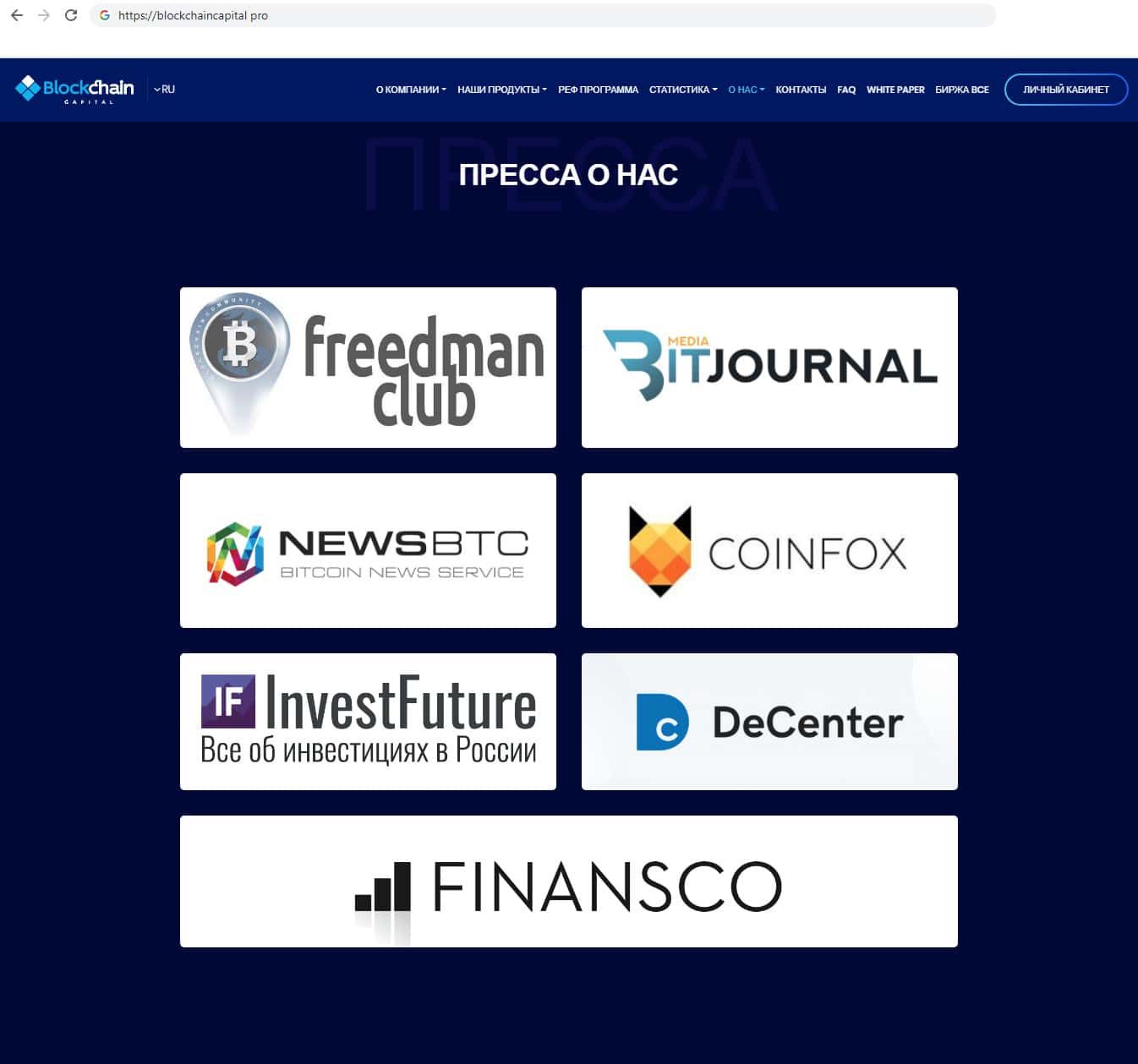 На сайте разводил BlockchainCapital Pro есть раздел, в котором компания представила информацию о себе, которую опубликовала пресса. Но на самом деле фирма просто купила эти статьи, ведь всем прекрасно известно как работает пресса, если им заплатить, то они опубликуют что угодно, чем и успешно пользуются мошенники BlockchainCapital Pro.