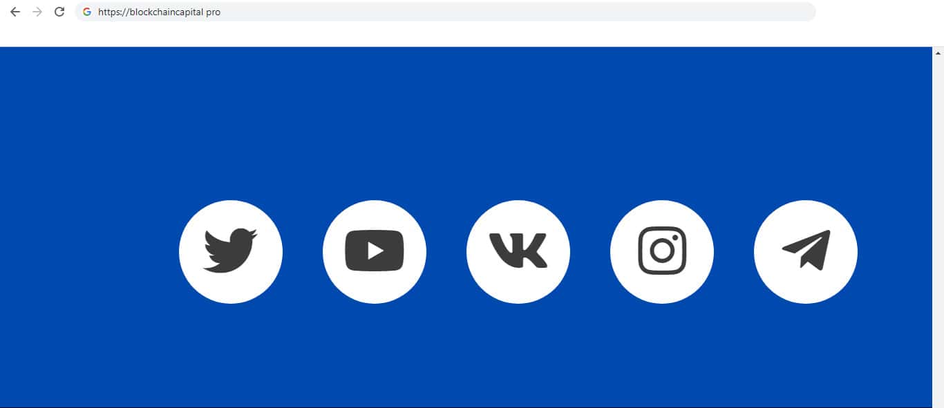 Данные мошенники для того, что бы набрать больше клиентов решили зарегистрировать аккаунты в социальных сетях. Ссылки на страницы указанны на главном сайте компании. Жулики BlockchainCapital Pro стараются показать, что они ближе к пользователям и пользуются социальными сетями, но они используют их только в качестве рекламы своей финансовой ловушки.