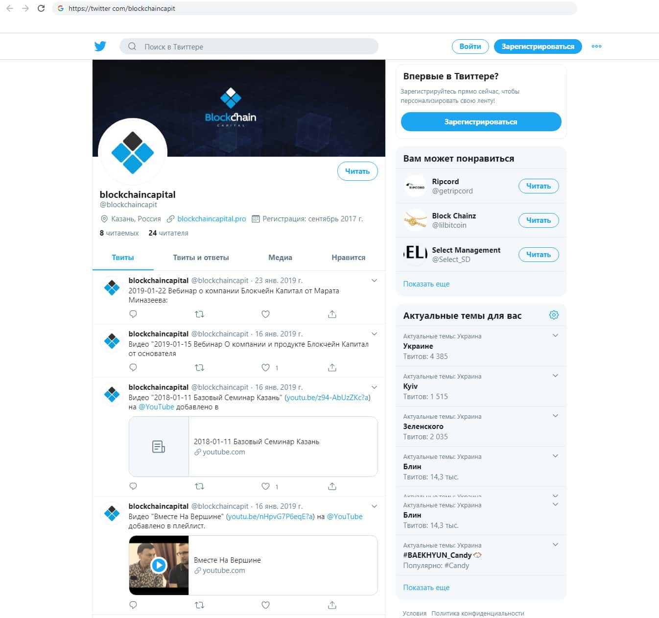 Но в твитере им не удалось накрутит подписчиков. Компания BlockchainCapital Pro набрала всего 24 подписчика, из которых большая половина это сотрудники компании. Сразу видна истинная популярность лохотрона. Видимо пользователи сразу раскусили фирму и не хотят никак с ней пересекаться, даже в социальных сетях.