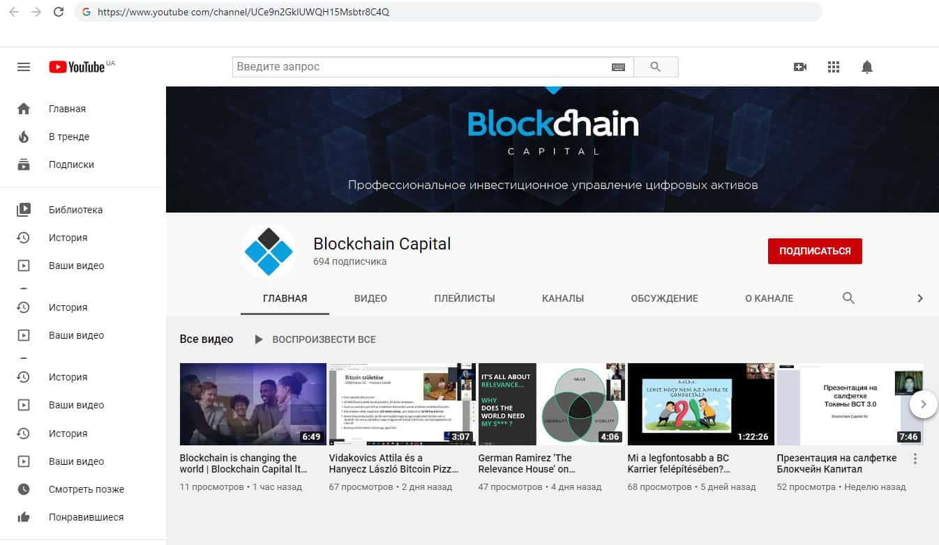 Фирма решила зарегистрироваться и на самом известном в мире видеохостинге - YouTube. Там жулики Блокчэйн Капитал публикуют свои видео, в которых показывают как можно заработать, но все эти видео просто подставные, что бы завлечь как можно больше пользователей, но судя по каналу на ютюбе у них это плохо получается, канал набрал всего более 600 подписчиков.