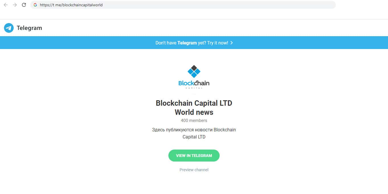 Лохотронщики Блокчэйн Капитал так же указали ссылку на закрытый канал в телеграмме, где публикуют новости компании. На этом канале присутствуют 400 участников, это говорит о том, что на сайте информация о количестве клиентов слишком преувеличенна. С помощью новостей, которые жулики публикуют на канале они манипулируют клиентами.