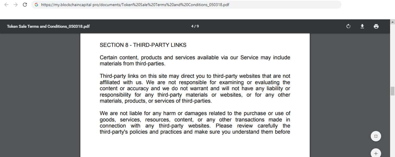 - Возмутительные пункты условий использования сайт мошенников BlockchainCapital Pro