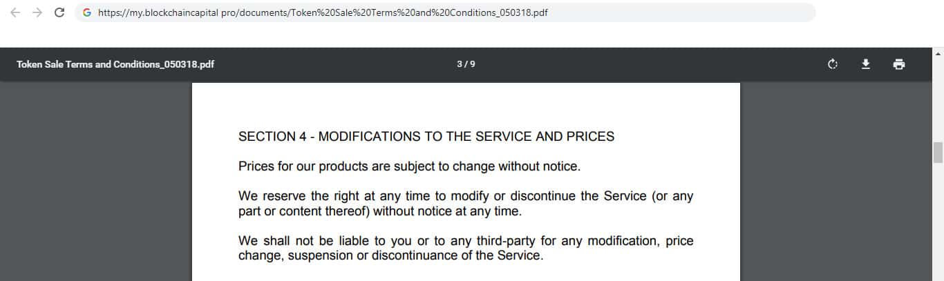 Так же в этом соглашение присутствует пункт о том, что жулики BlockchainCapital Pro могут изменять цены на свои продукты в любую сторону и в любое время на своё усмотрение. Но так же они могут прекратить работу своего сервиса в любой момент, не смотря на то, что внутри компании очень много денег инвесторов, которые к ним никогда не вернуться.