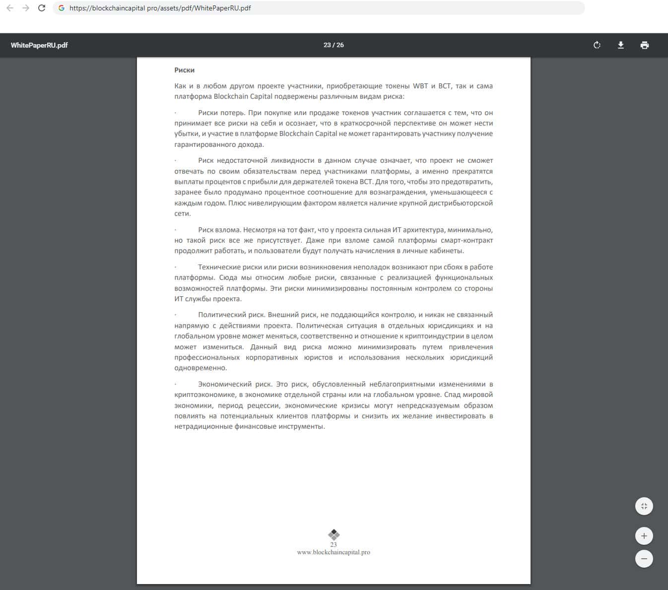 Лохотрон BlockchainCapital Pro представил пользователям предупреждение о рисках сотрудничества с компанией. В этом документе указанны различные риски, последствие которых это потеря средств, и даже технические риски влекут за собой потерю средств исключительно не в пользу клиента, что очень странно.