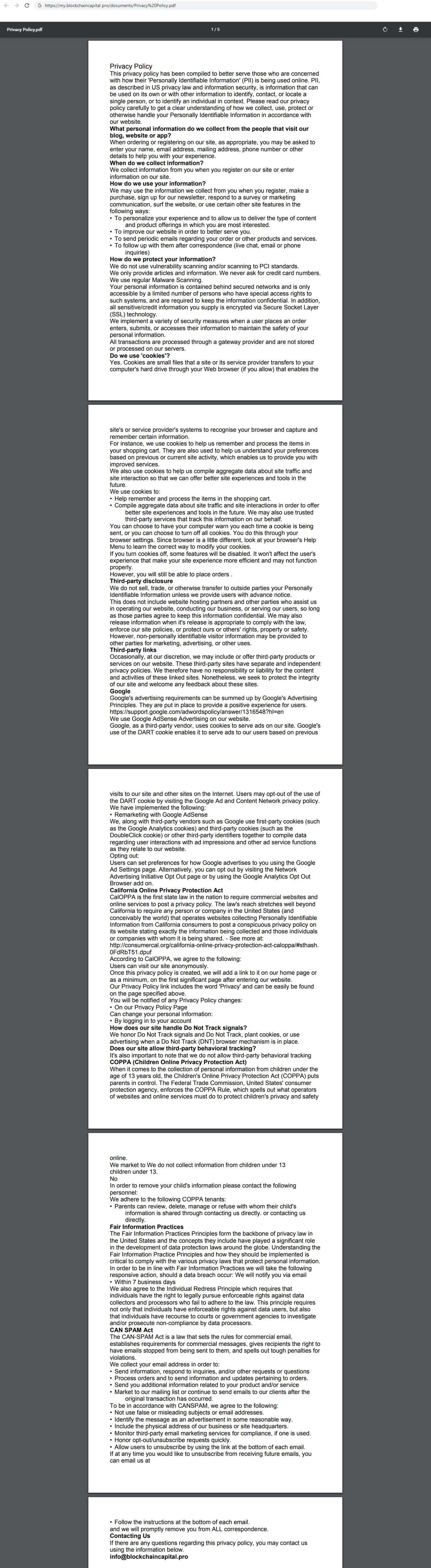 Шарашкина контора Блокчэйн Капитал предоставила на своём интернет ресурсе политику конфиденциальности. Этот документ скорее всего компания скопировала у других жуликов, так как она практически идентична такой же политике, которую в основном используют мошенники. В неё компания просто рассказывает о информации, которую собирает и как использует её.