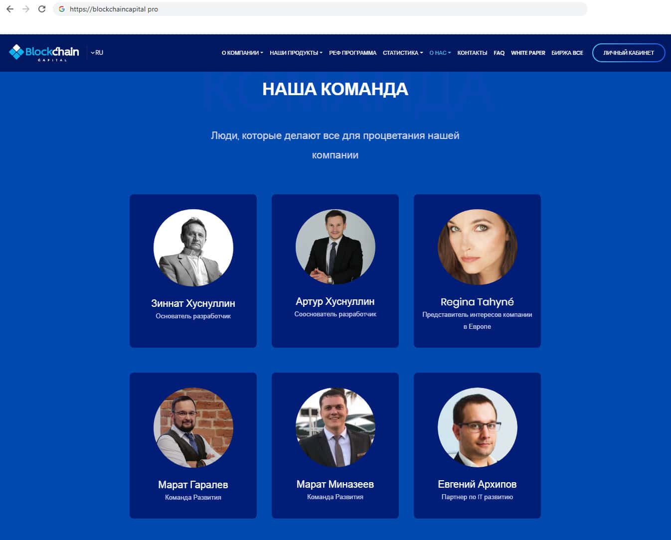 Компания разводил BlockchainCapital Pro представила информацию о своём руководстве и команды, которая по мнению - сайта помогает процветанию компании. На фото показаны якобы сотрудники фирмы, но этой информации можно не верить, так как скорее всего это все вымышленные люди, имена придуманы, а фото посторонних людей, которые никак не связанны с фирмой.