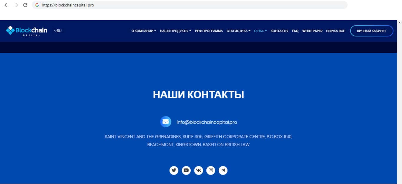 Компания финансовых мошенников BlockchainCapital Pro указала на своём сайте, что фирма зарегистрирована по адресу: SAINT VINCENT AND GRENADINES, SUITE 305, GRIFFITH CORPORATE CENTRE, P.O.BOX 1510, BEACHMONT, KINGSTOWN. BASED ON BRITISH LAW, что является оффшорной зоной, и позволяет разводилам кидать людей на деньги.