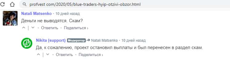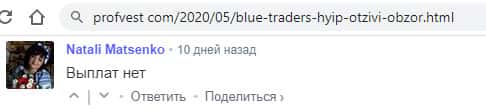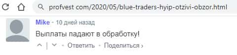 - Клиент Блу Трейдерс пишет, что проект остановил выплаты и он ничего не может получить