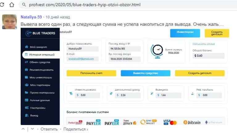 Тут человек не может вывести не то, что депозит из лохотронской конторы Blue Traders, а даже свой процент! Собственно, ради которого он и заводил туда деньги. Но вот только вывести назад у него их просто не получится. Потому что это изначально жульнический хайп-проект, который никому деньги не выводит.