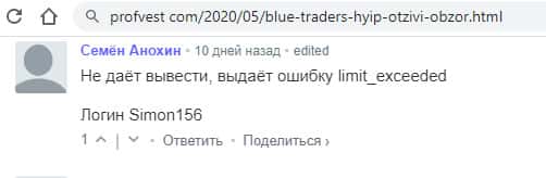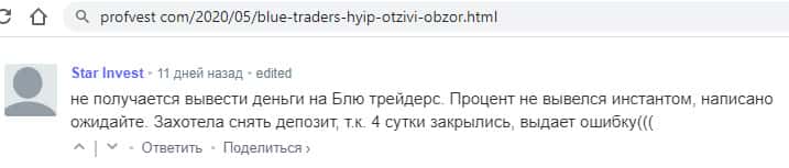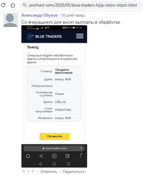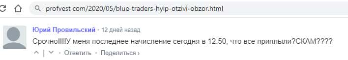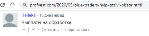 Клиент Блу Трейдерс пишет, что проект остановил выплаты и он ничего не может получить