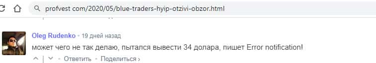 - Человек попытался вывести из Блу Трейдерс 34 доллара, но ему тоже выдало ошибку