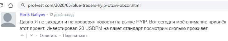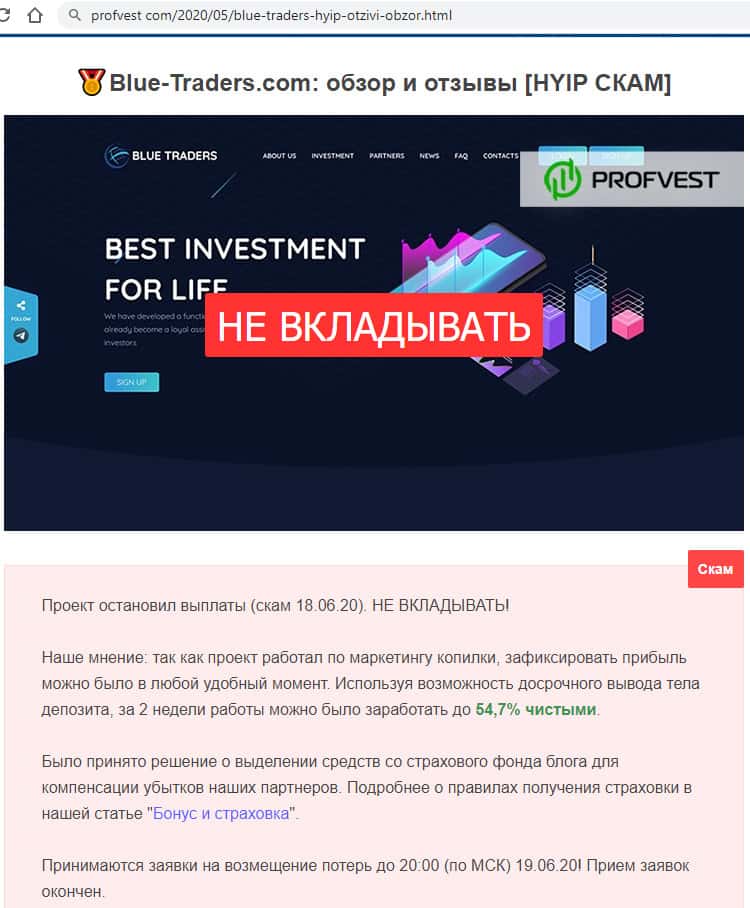Еще один авторитетный ресурс говорит о том, что вкладывать свои деньги в такой проект, как Блу Трейдерс не стоит, потому что проект сам по себе сомнительный и он уже остановил выплаты своим клиентам. В такой ситуации вкладывать - это просто отдать свои деньги незнакомому дяде. Закончится все плохо.