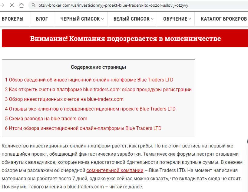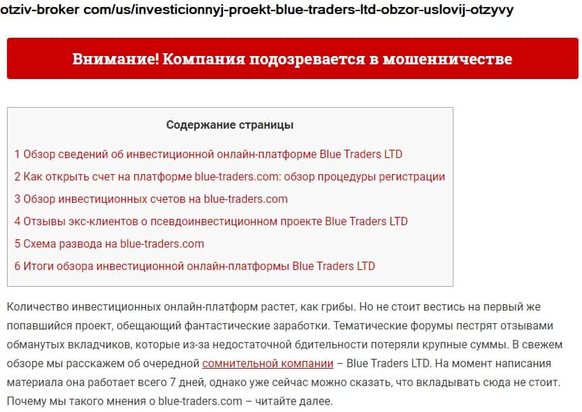 - Еще один ресурс прямо и открыто говорит о том, что Блу Трейдерс подозревается в мошенничестве
