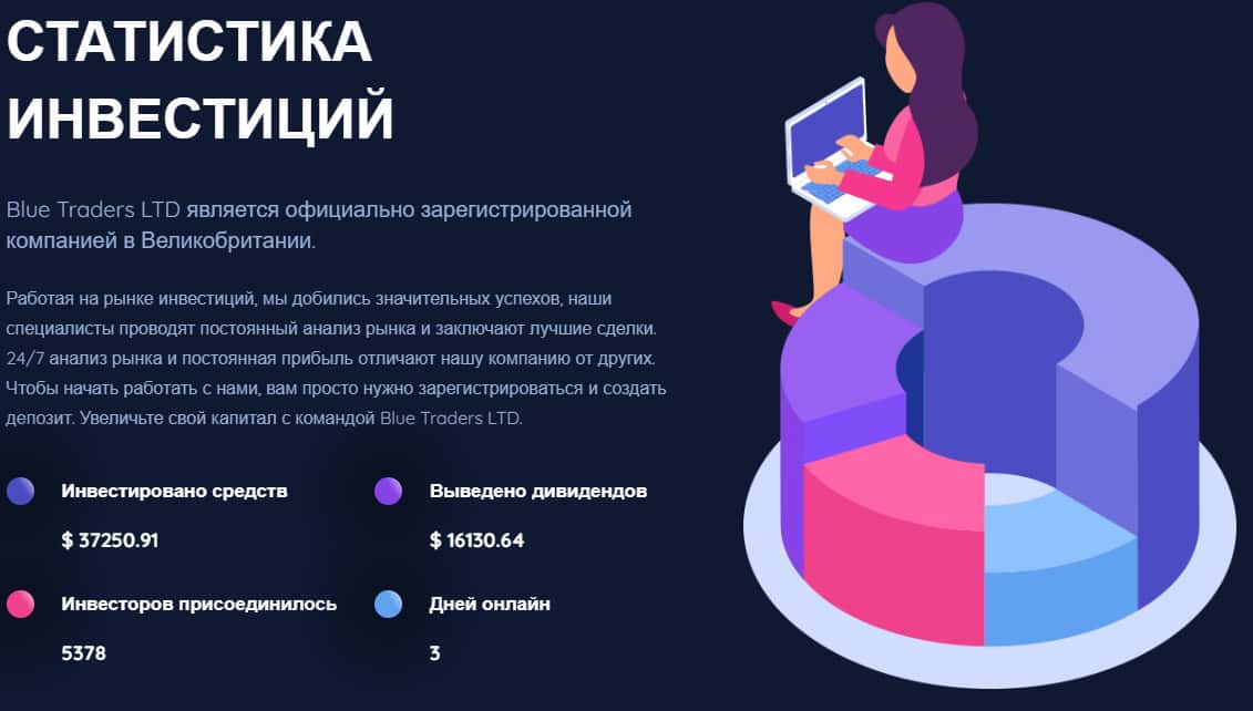 Естественно, для того, чтобы клиент как можно быстрее попал в их липкие лапы, мошенники Blue Traders показывают рисованную статистику инвестиций в их хайп-проект. Все циферки там, конечно, рисованные, потому что по-другому и быть не может. Но именно так они и привлекают к себе новых жертв.