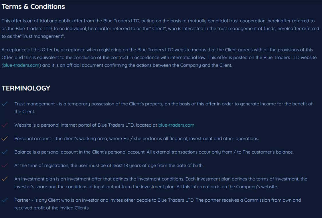 Договор у жуликов Блу Трейдерс представлен в качестве публичной оферты на сайте. Так сейчас многие делают. Что мол если ты поставил галочку и согласился со всеми условиями, то договор считается заключенным. Только этот договор - филькина грамота. Он никак не защитит вас от кидка со стороны жуликов.