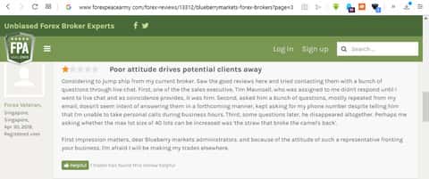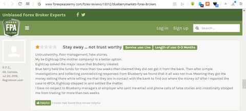 На том же сайте-форуме forexpeacearmy, посвященному форекс брокерам, их анализам и трейдингу на последних, присутствует отрицательный отзыв мошеннической конторы Блуберри Маркетс, который был явно написан от злости на этих псевдо-трейдеров. Там говорится о полной безопасности тех, кто не решился на работу с ними и надежности, а также о сожалении к тем, кто не успел вовремя прекратить работу с этим мошенникам.