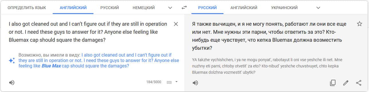 Перевод отзыва о жуликах на сайте translate.google com