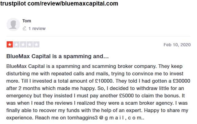 Основной метод, которым действует контора BlueMax Capital - это рассылка спама. Не дай Бог вам оставить им номер своего мобильного телефона, они вас задолбают своими рассылками. Человек повелся на эту уловку и потерял в этой жульнической конторе 10 000 фунтов.