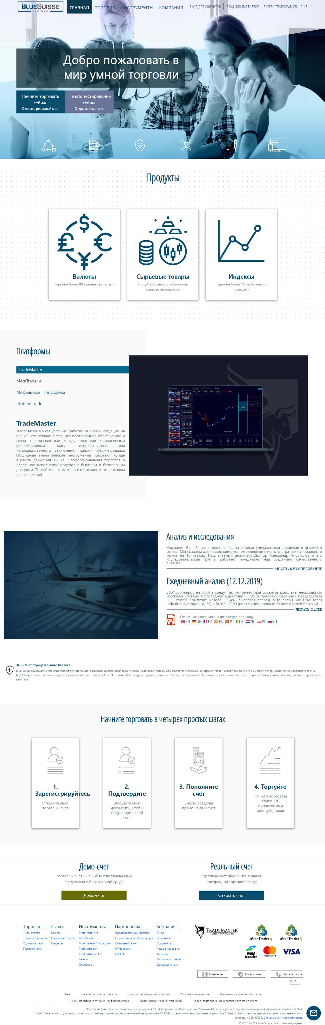Blue Suisse - жульническая структура, занимающаяся обдиранием своих наивных клиентов, предоставляя липовый доступ на Форекс-рынок. Мошенники используют все те же схемы развода, которые были ранее замечены в других организациях, ничего нового не привнесли в развитие жульнической индустрии. Не ведитесь на развод!!!