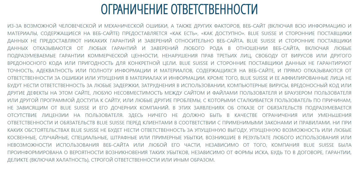 Также интересен факт того, что контора Blue Suisse не несет ответственности за убытки, причиненные клиенту, в случае нарушения брокерской конторы, обслуживающей фондовую биржу или организатора торговли. То есть из этого следует, что контора скидывает все косяки на своих партнеров, а клиента, в случае казуса, просто оставляет ни с чем.