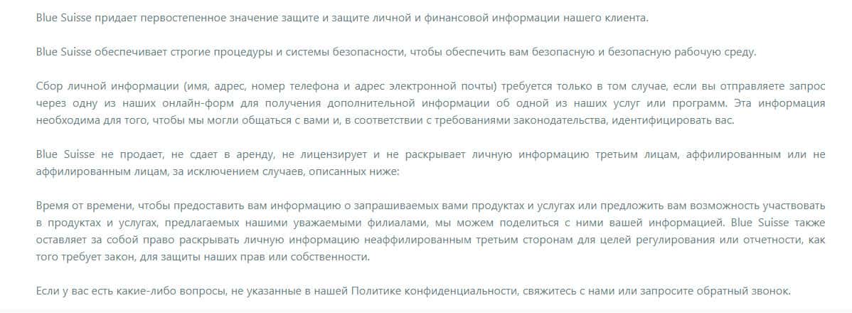 После того как внимательно прочитаешь политику конфиденциальности конторы Блуе Свисс, то сразу появляется какое-то двойственное понимание. С одной стороны они готовы не распространять и сохранить информацию о клиентах, а с другой - есть лазейки, через которые данные могут уйти третьим лицам.