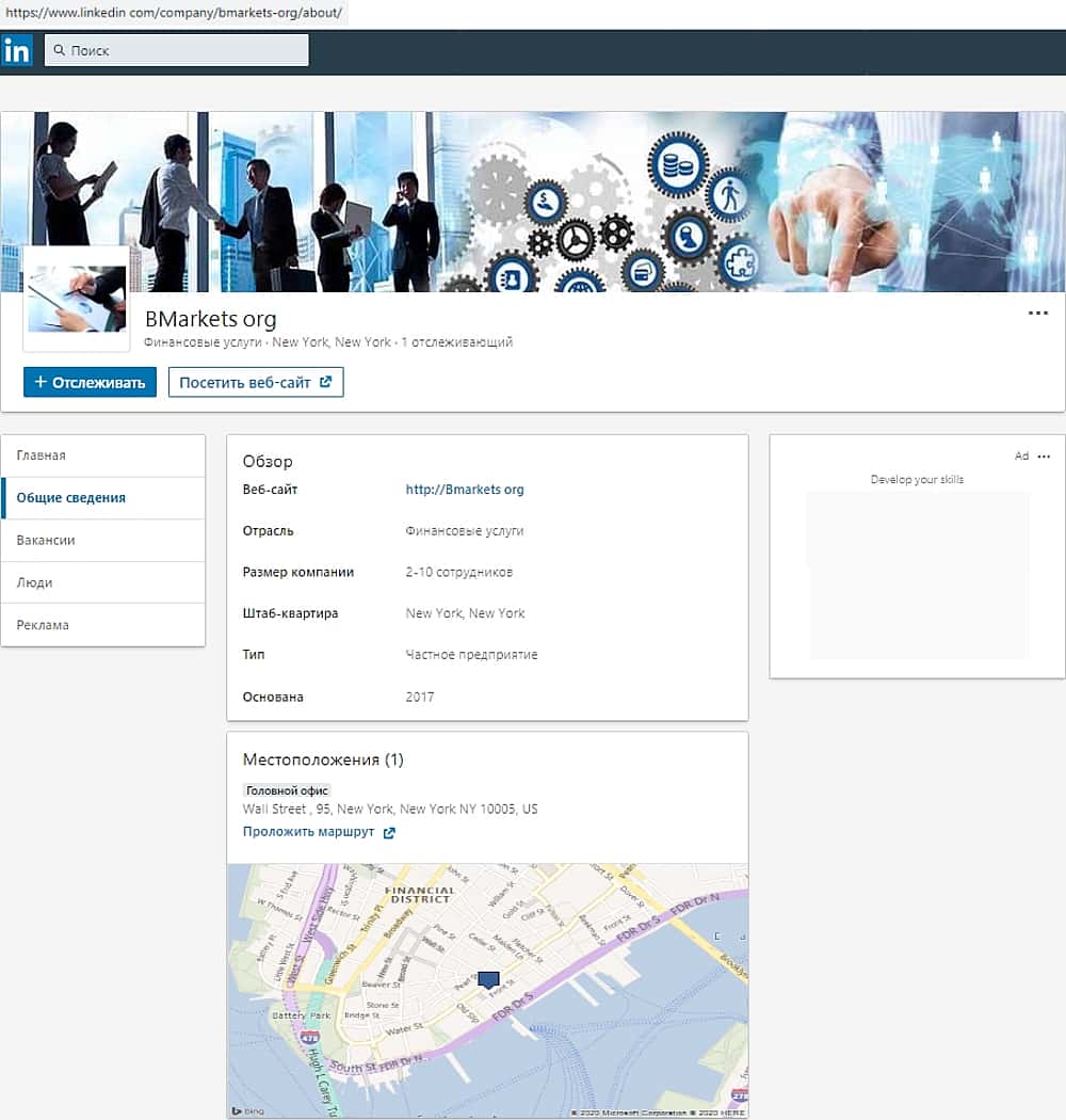 Живой ресурс, принадлежащий аферюгам BMarkets как ни странно нашелся. Не смотря на отсутствие публикаций, махинаторы все же имеют группу, созданную в онлайн-сервисе linkedin com. Здесь можно подчерпнуть немного информации, но в целом нужно сказать, что жулики практически полностью позаметали следы своего пребывания.