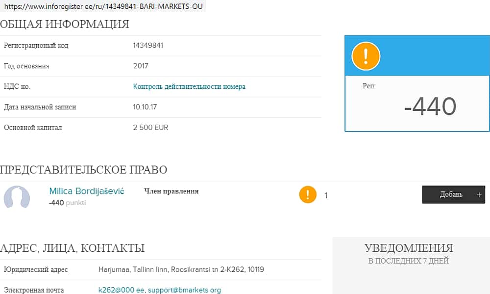 На сервисе inforegister ee был найден еще один адрес. Видимо жулики наделали себе липовых филиалов, чтобы проще было затеряться, когда мыльный пузырь БМаркетс лопнет. Почтовый ящик, принадлежащий домену авантюристов БМаркетс, засветился при регистрации сомнительной организации Bari Markets OU в Эстонии. Вот контактные данные: