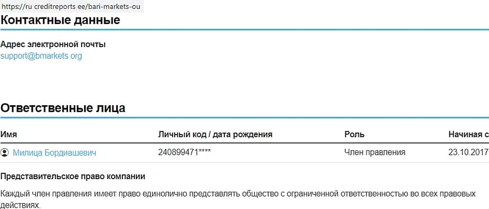 Сервис отчетов creditreports ee, при проверке компании Bari Markets OU, раскрыл имя руководителя организации. Данная конторка является ничем иным, как документальным прикрытием шараги БМаркетс. Возможно, что указанный руководитель всего лишь подставное лицо, но так или иначе в документах оно присутствует:
