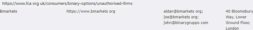 Кое-что интересное о торговцах воздухом БМаркетс удалось обнаружить на страницах регулятора Великобритании. Как оказалось, деятельность катал БМаркетс была незаконна, и шарлатаны попали в черный список. Удалось обнаружить некоторые контакты жулья БМаркетс, в которых замечена их связь с аферистами BinaryGruppo: