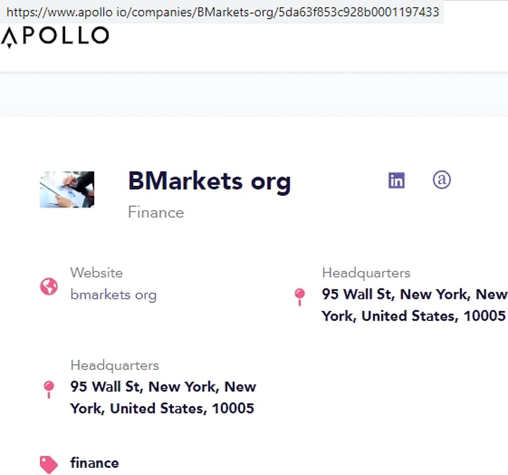 Некоторую информацию о проходимцах БМаркетс выложил на своих страницах сервис-платформа для ведения бизнес-деятельности apollo io. Здесь можно заметить, что адрес с которым зашли аферисты на данный проект, отличается от указанного регулятором Великобритании и находится в Соединенных Штатах: