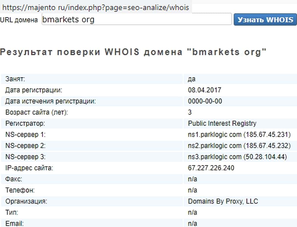 Анализ доменного имени форекс-злодеев BMarkets показал, что оно, как и сама недоконторка, появились в 2017 году. На кого был оформлен домен, мошенники BMarkets решили не разглашать, чтобы не было после ненужных вопросов. Поэтому информация о владельце останется тайной за семью печатями.