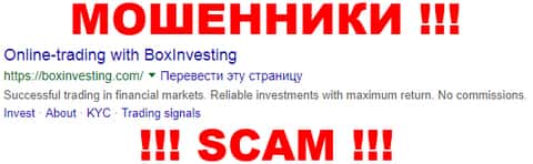 Бох Инвестинг - это очередные мошенники сети интернет, которые зарабатывают на наивных пользователем путем развода последних на деньги под предлогом торговли форекс на их подвальной и кухонной платформе. Связываться с аферистами BoxInvesting мы определенно не рекомендуем !!!