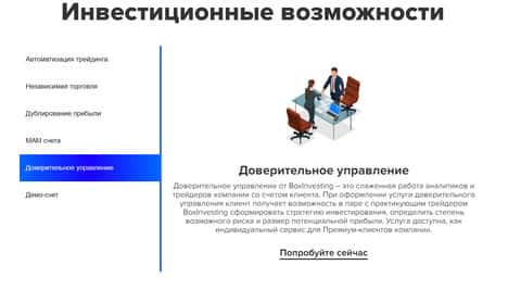 Далее жулики BoxInvesting размещают полный перечень услуг, под которыми они сливают счета своим клиентам. Среди них есть плачевно известное доверительное управление и копирование сделок, именно под предлогом которых мошенники Бох Инвестинг сольют вам счет.